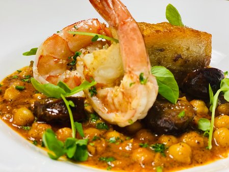 Other dishes on the menu include Bavette Baguette (seared skirt steak, caramelized onions, horseradish vinaigrette), Grilled Rockfish (with peppers, tomatoes, chorizo, garlic, white wine, herbs), Grilled Rib Eye Steak and Garlic Buttered Snails, A dish with shrimps, mussels, clams and calamari.